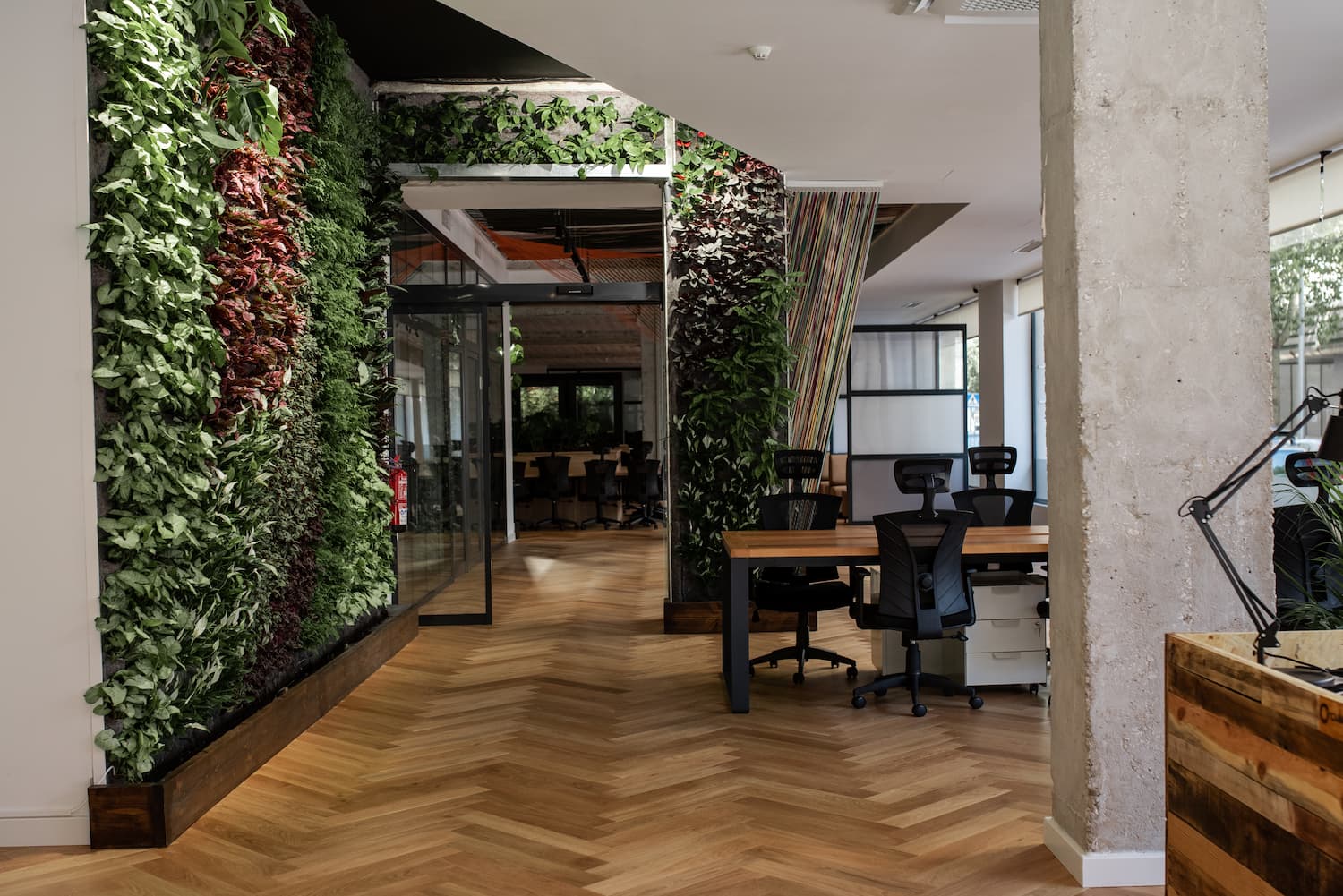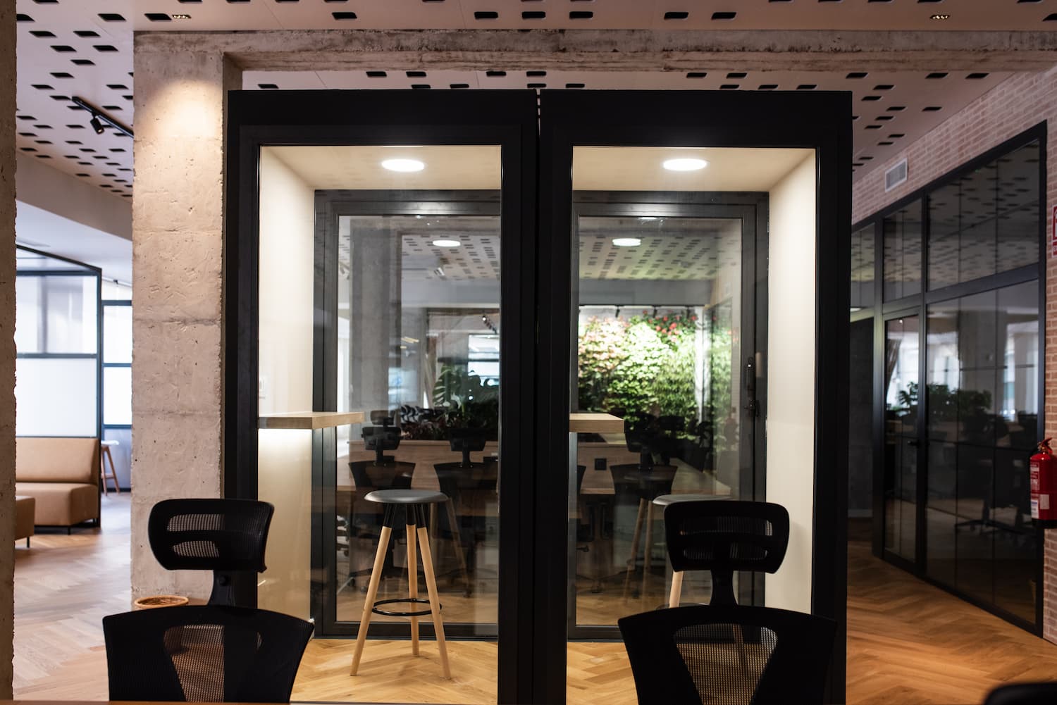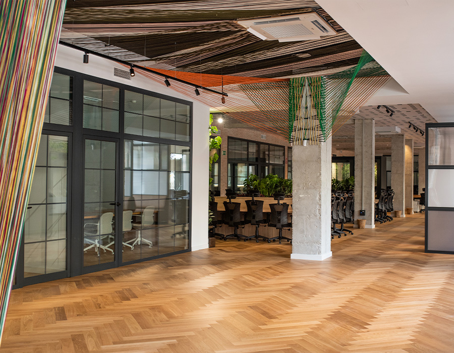 Located in the heart of Málaga, this coworking space blends industrial character with natural warmth. Raw finishes like exposed concrete, oak herringbone floors, and warm-toned bricks are softened by tactile fabrics and abundant greenery.