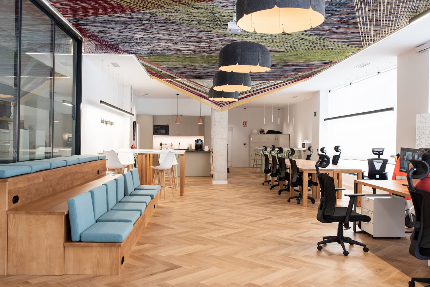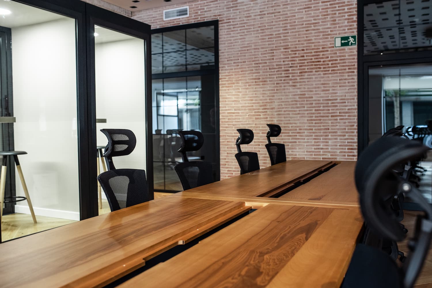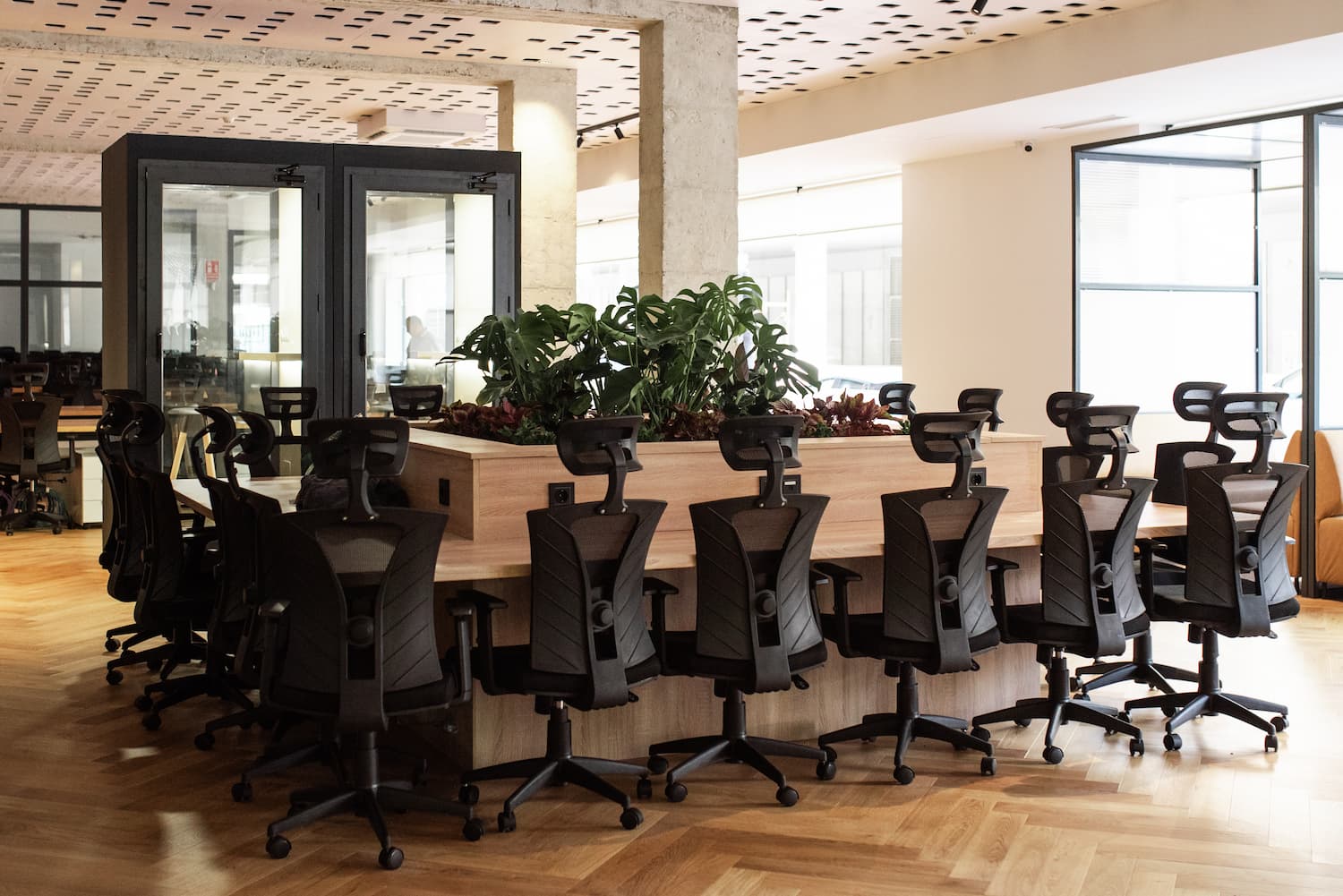 Located in the heart of Málaga, this coworking space blends industrial character with natural warmth. Raw finishes like exposed concrete, oak herringbone floors, and warm-toned bricks are softened by tactile fabrics and abundant greenery.