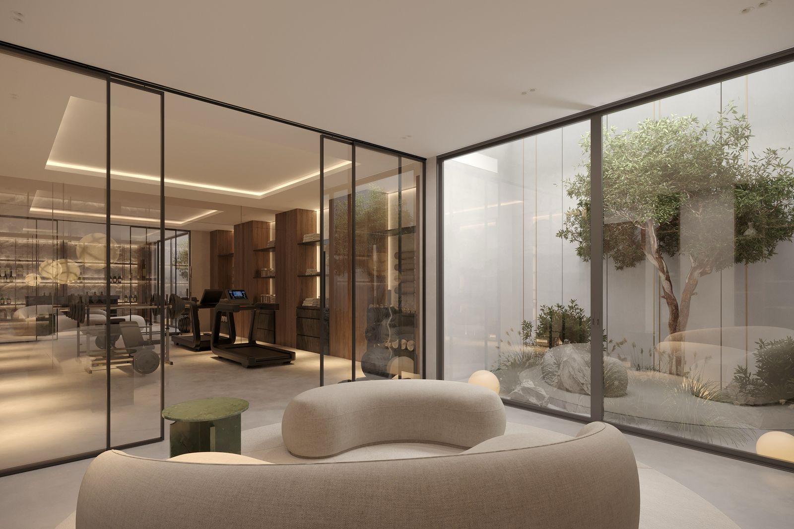 On the lower level, the home reveals a multifunctional space that combines a private gym, a wine cellar, and an informal lounge. The soft curves of the furniture contrast with the geometric architecture, while the internal courtyard—home to a centuries-old olive tree—becomes the emotional core of the space.