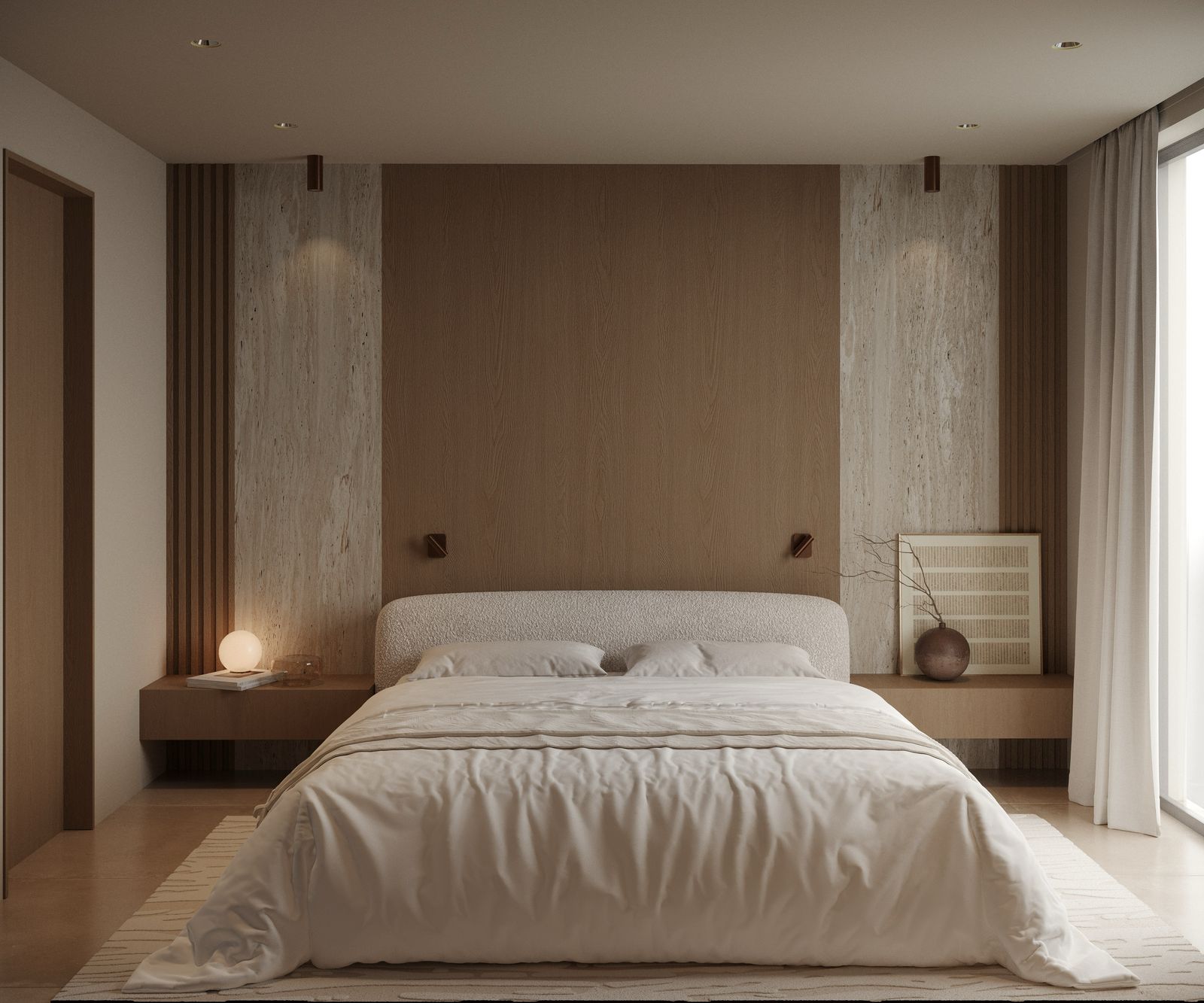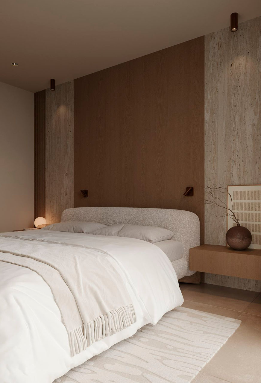 In the night area, the master bedroom radiates calm and texture through a refined mix of natural wood, travertine, and enveloping textiles. Every detail is designed to encourage rest and visual comfort.