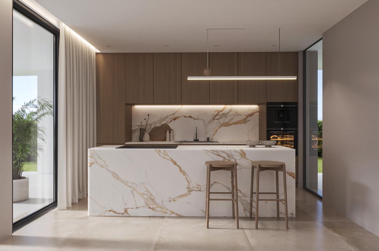 The main floor is organized around a double-height living space, flooded with Mediterranean sunlight through expansive windows. The kitchen, featuring a sculptural island in veined marble, blends aesthetics and functionality, becoming the social heart of the home.