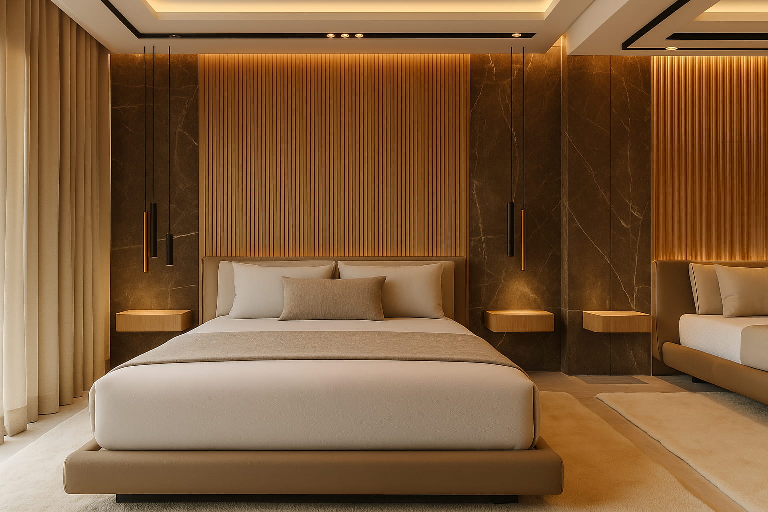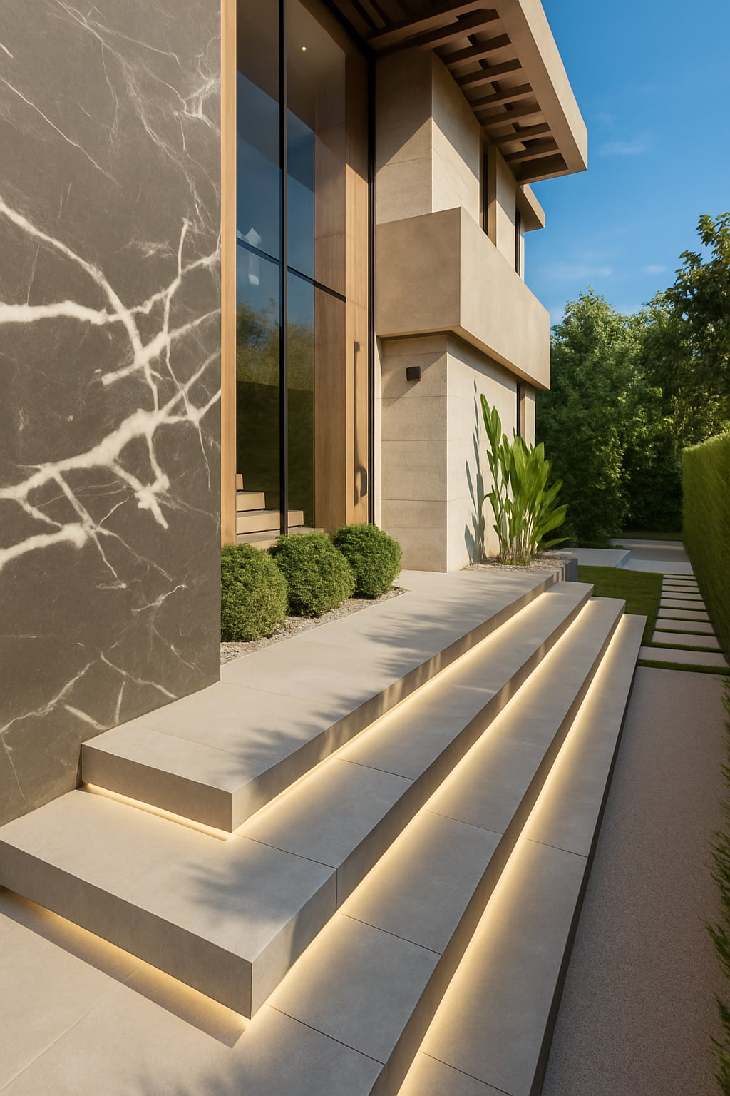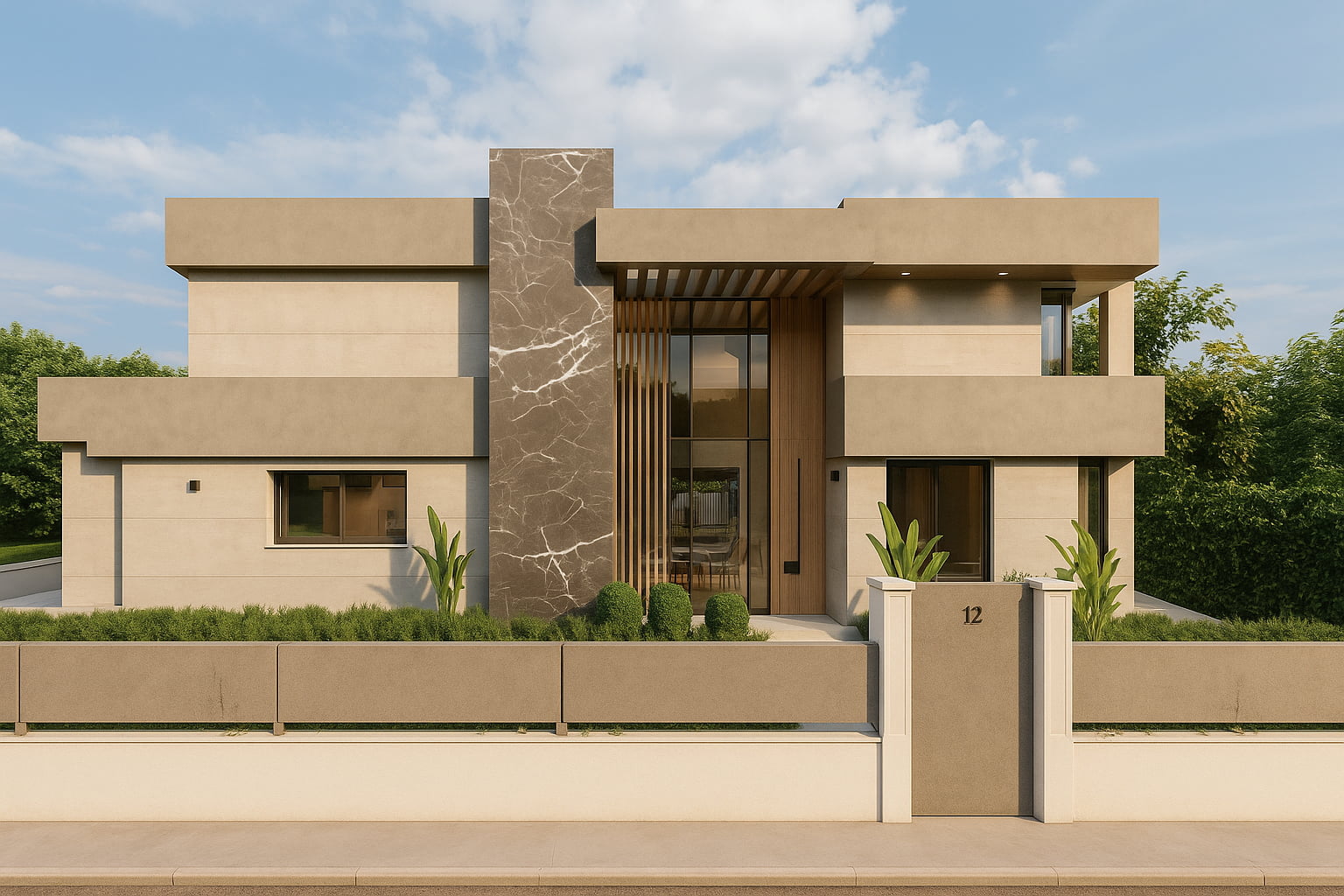 Natural stone, wood and neutral textures dominate the façade, contrasted by a sculptural vertical element in veined marble. Floor-to-ceiling windows blur the boundary between indoor and outdoor, flooding the interior with natural light.